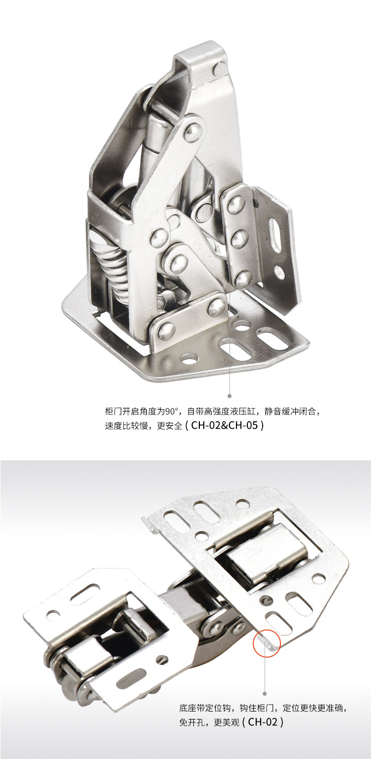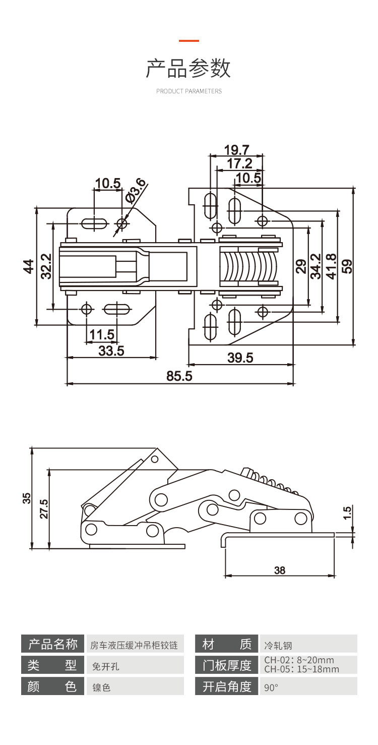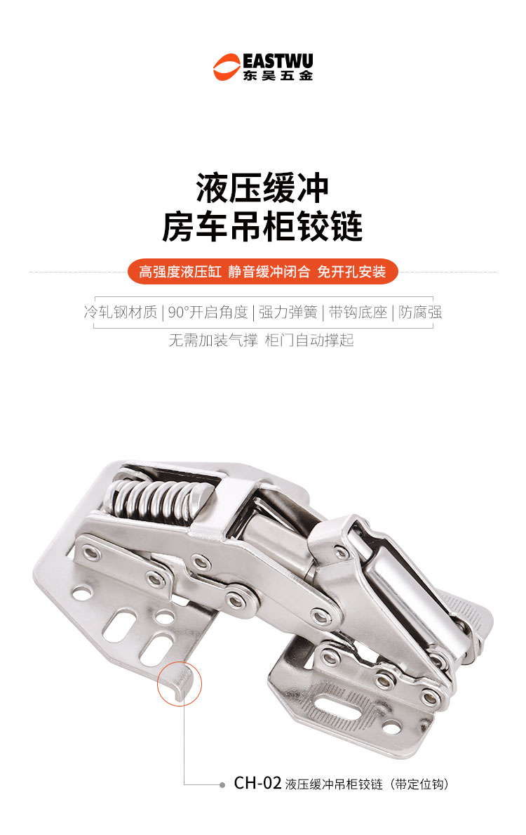 冷軋鋼房車(chē)吊柜緩沖鉸鏈 靜音緩沖 免開(kāi)孔 無(wú)需加裝氣撐 柜門(mén)自動(dòng)撐起 適用門(mén)厚15-18mm 開(kāi)啟角度90° 使用范圍房車(chē)吊柜、衣柜等
