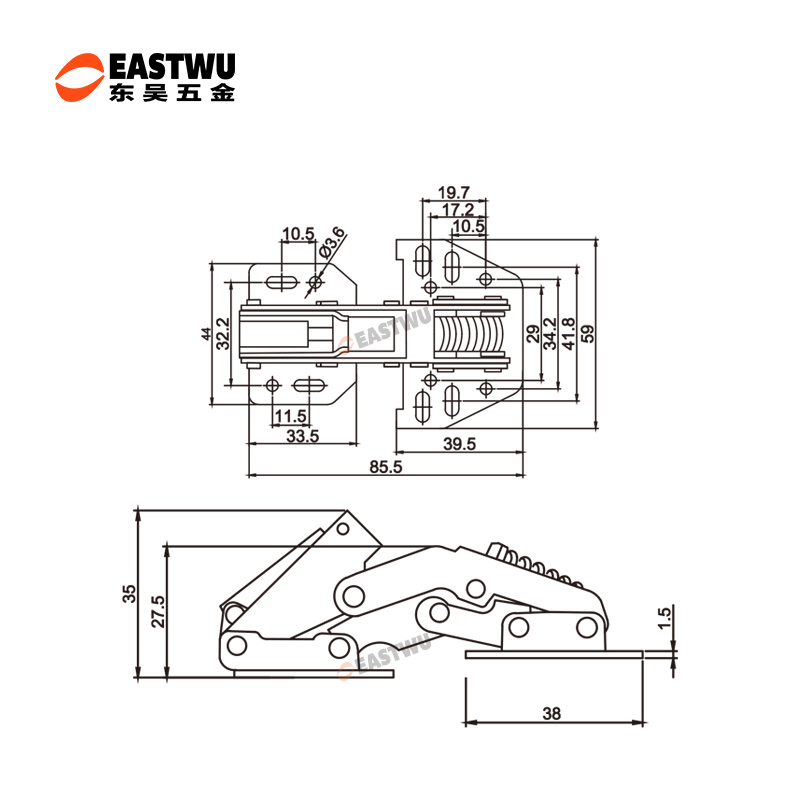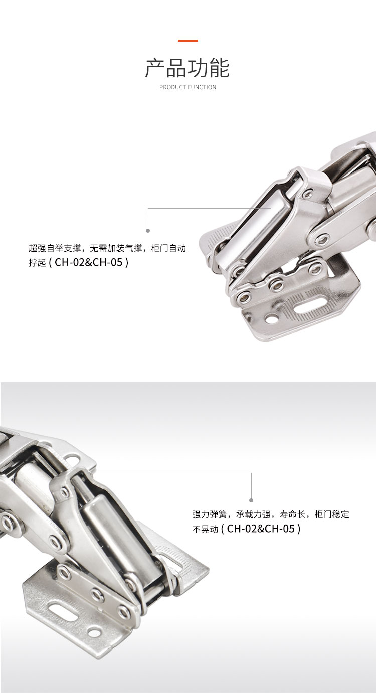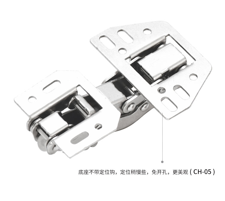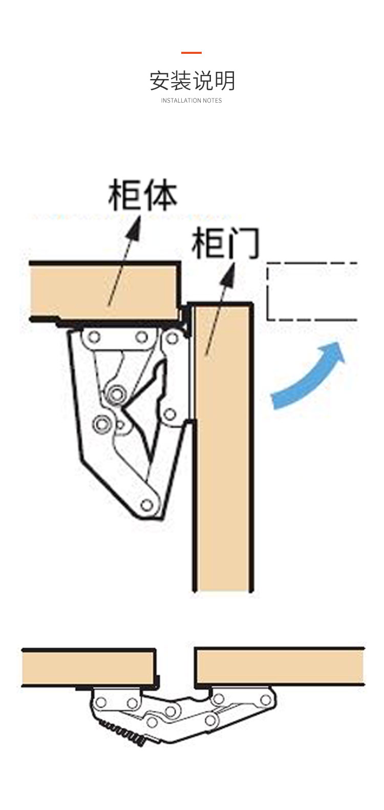 冷軋鋼房車(chē)吊柜緩沖鉸鏈 靜音緩沖 免開(kāi)孔 無(wú)需加裝氣撐 柜門(mén)自動(dòng)撐起 適用門(mén)厚15-18mm 開(kāi)啟角度90° 使用范圍房車(chē)吊柜、衣柜等