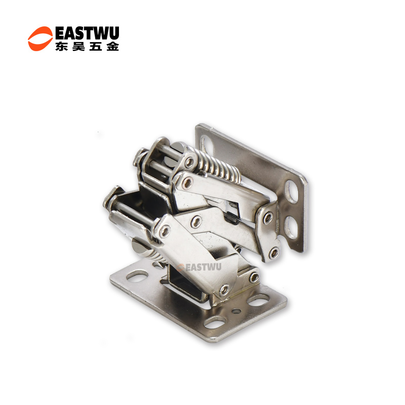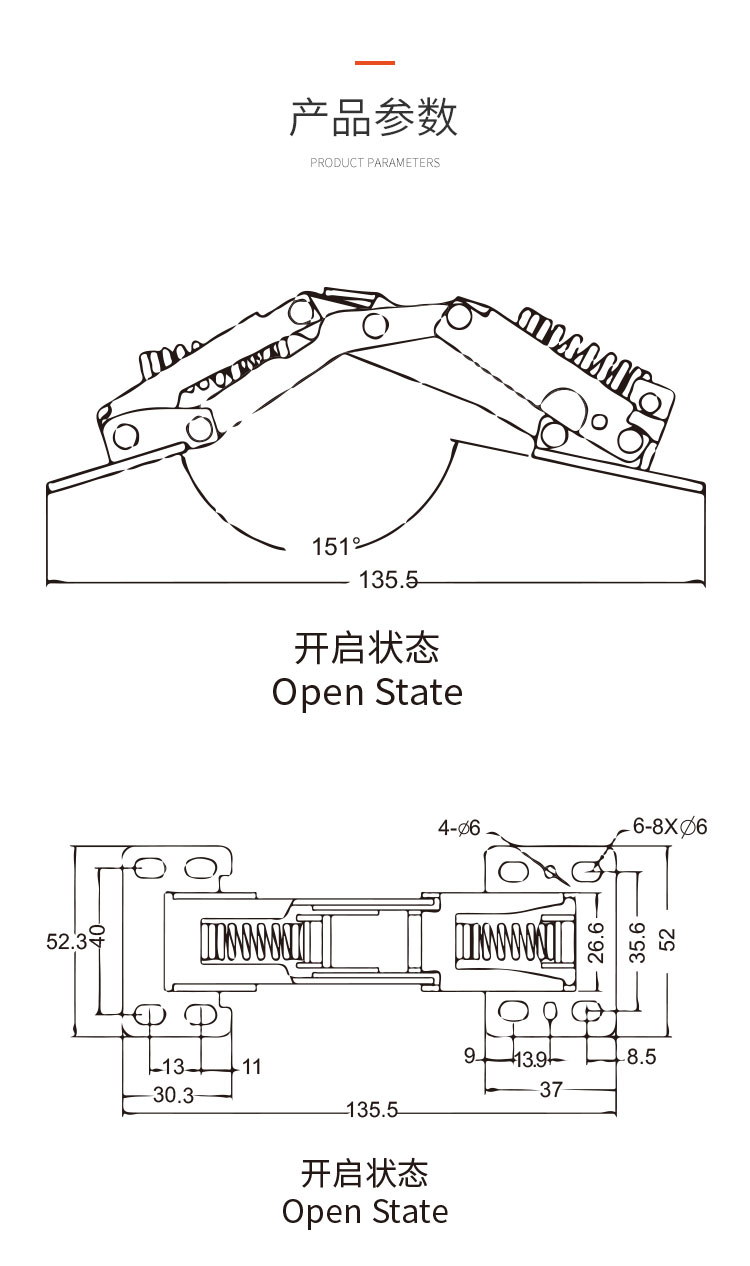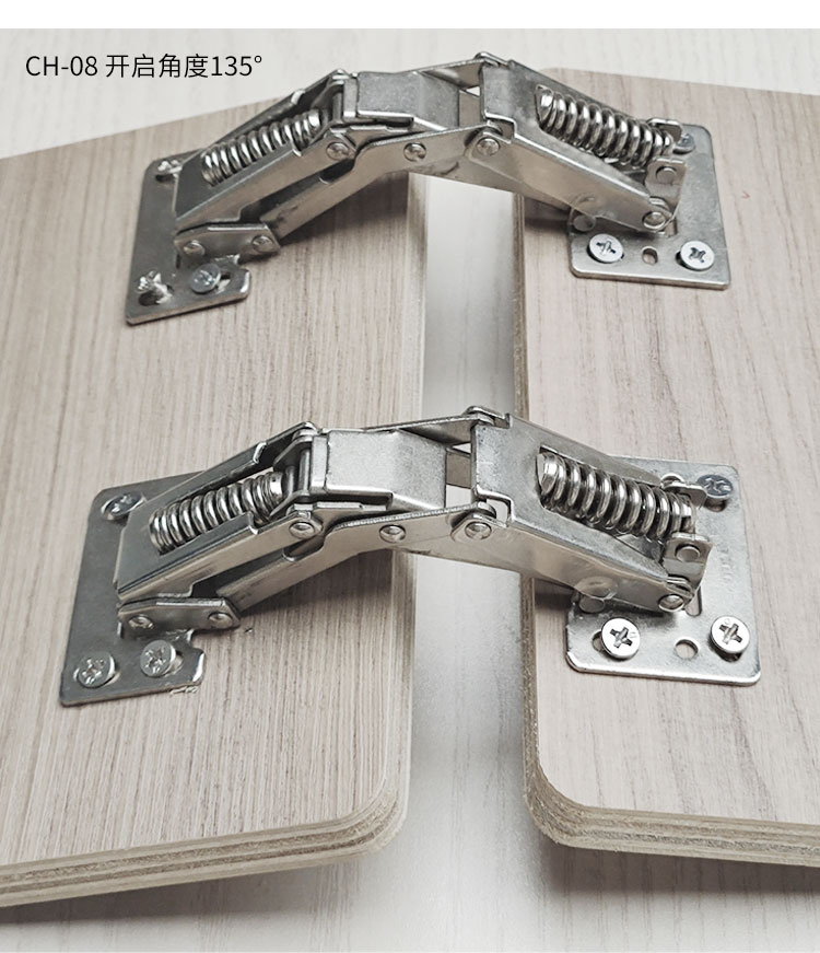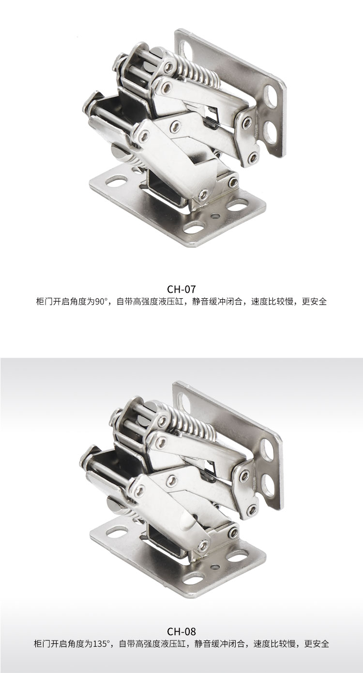 冷軋鋼房車吊柜緩沖鉸鏈 靜音緩沖 免開孔 無需加裝氣撐 柜門自動撐起 適用門厚15-18mm 開啟角度90° 使用范圍房車吊柜、衣柜等