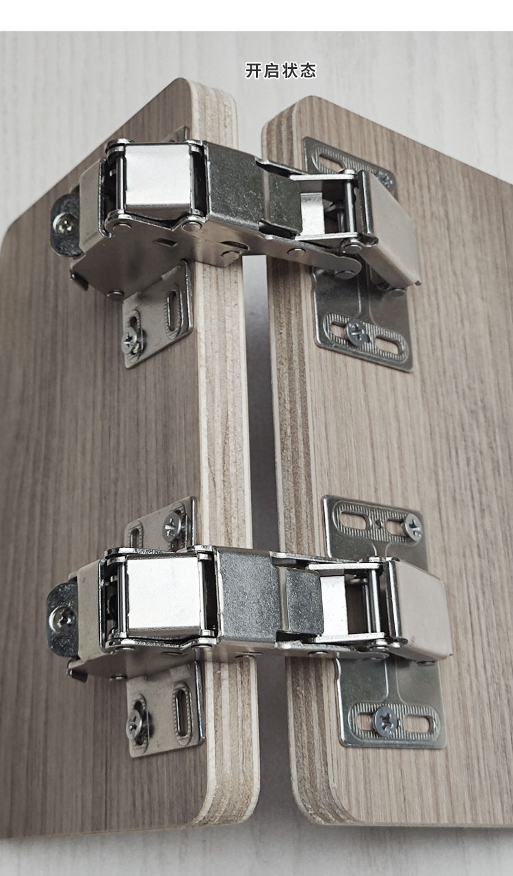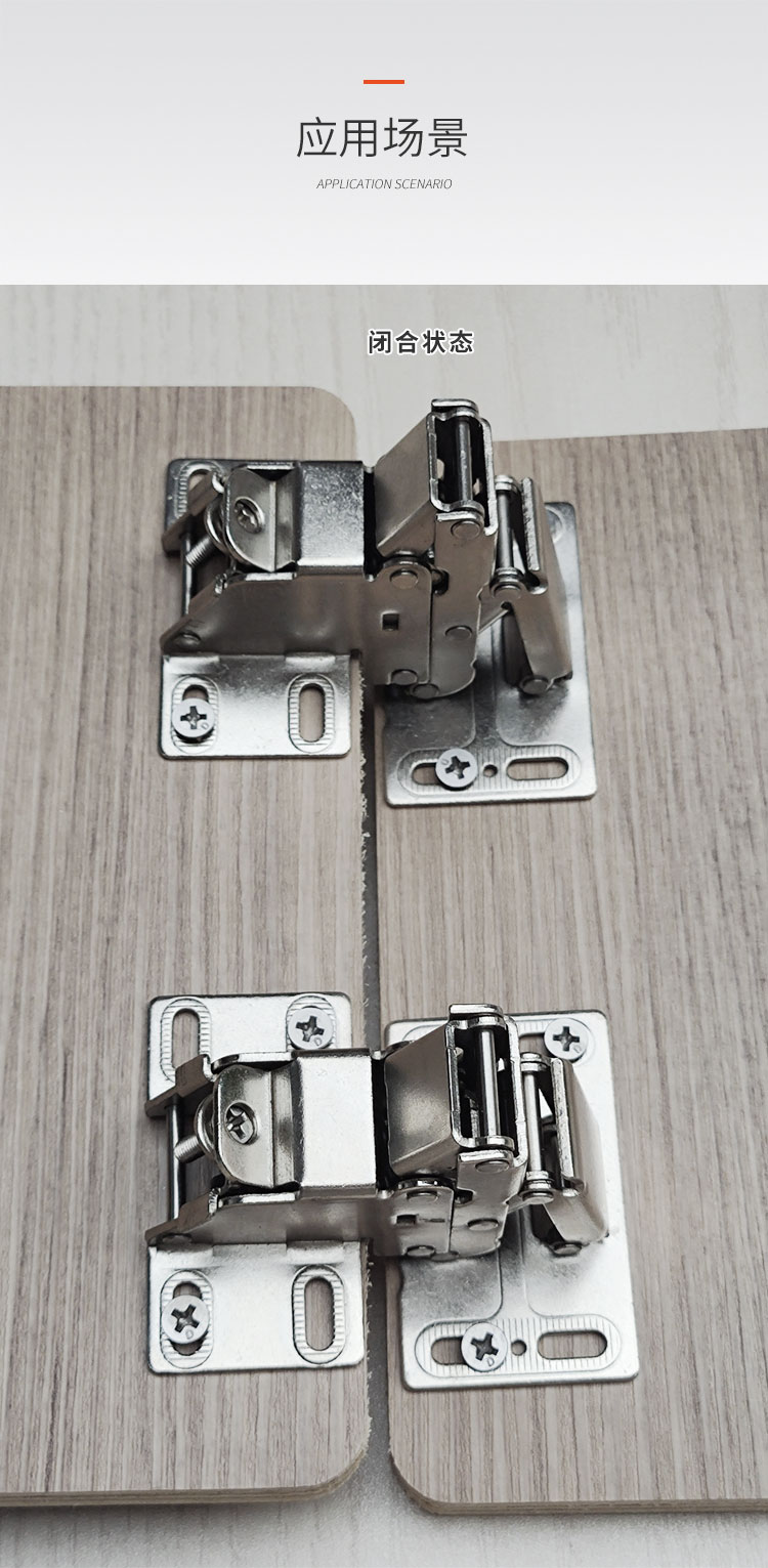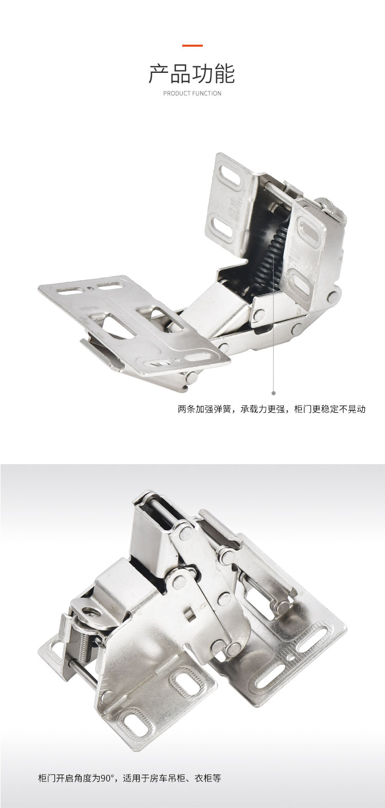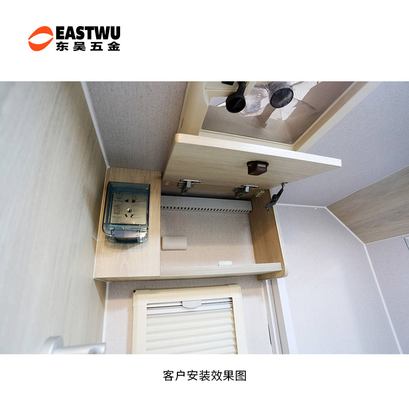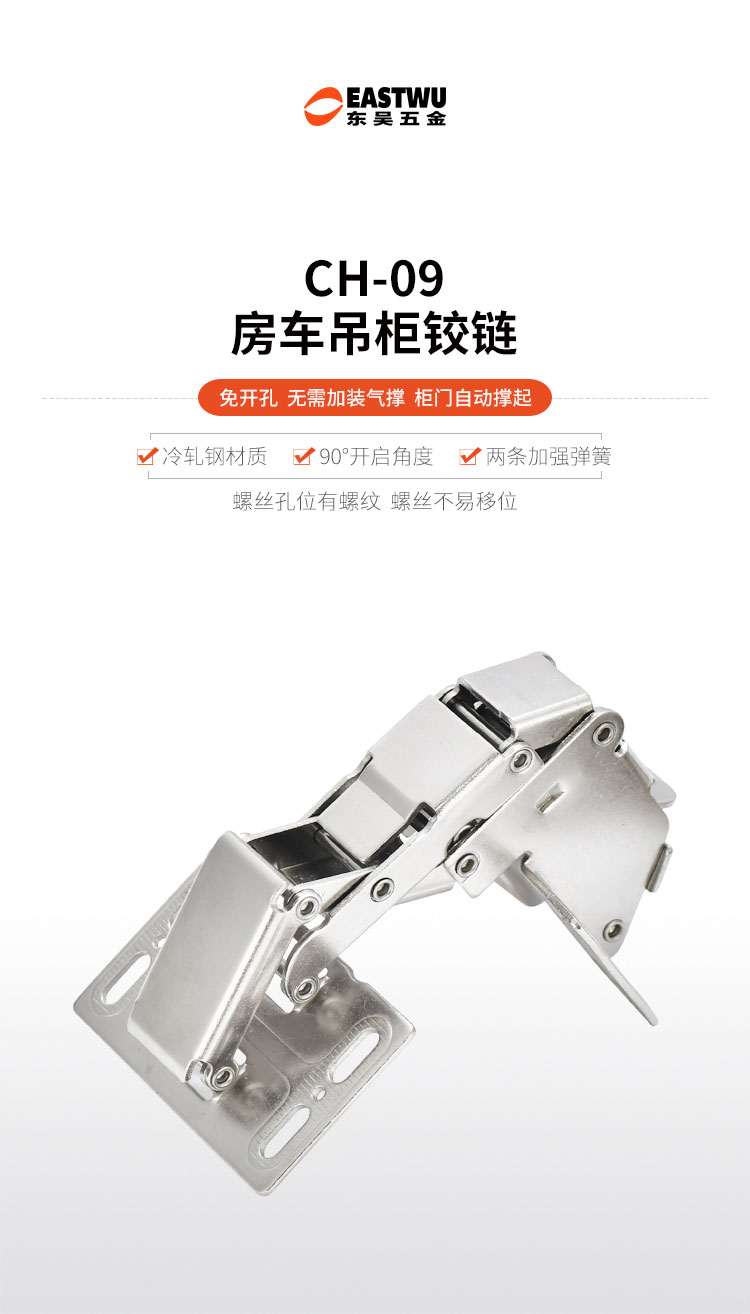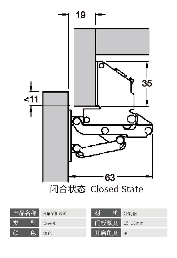 冷軋鋼房車(chē)吊柜鉸鏈 免開(kāi)孔 無(wú)需加裝氣撐 柜門(mén)自動(dòng)撐起 適用門(mén)厚15-18mm 開(kāi)啟角度90° 使用范圍房車(chē)吊柜、衣柜等