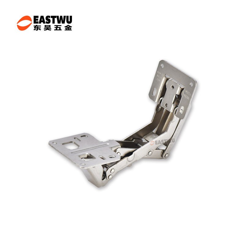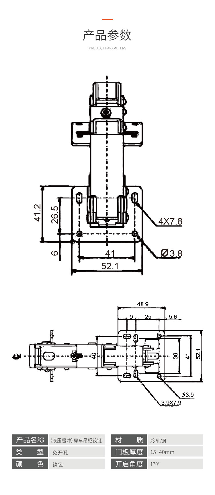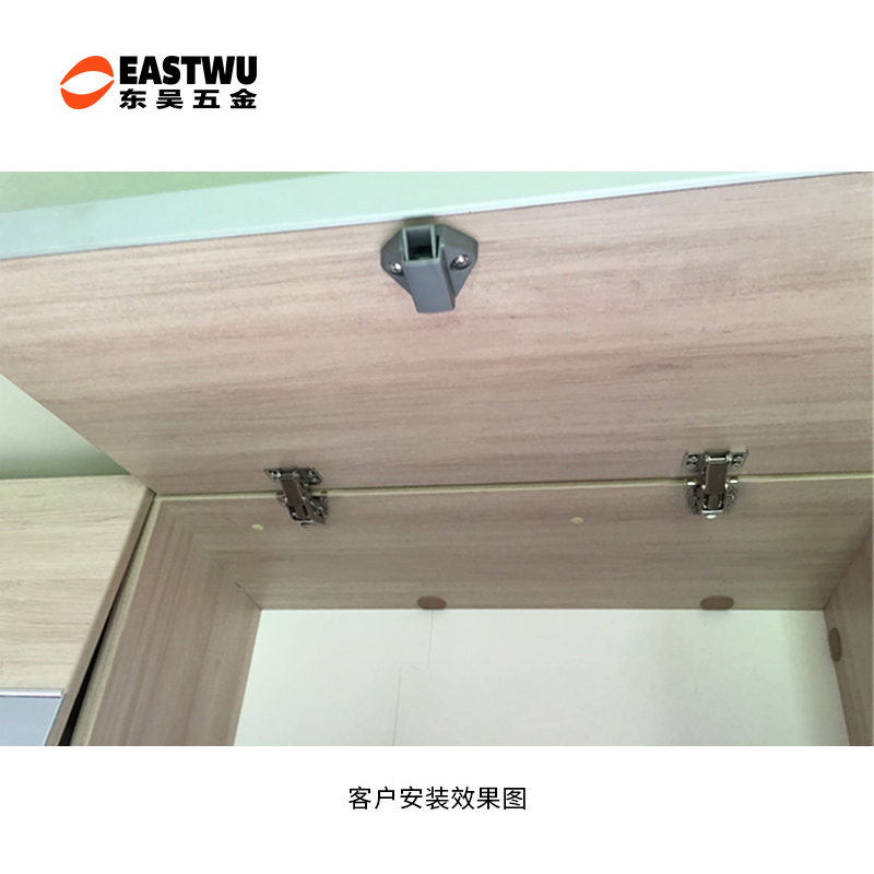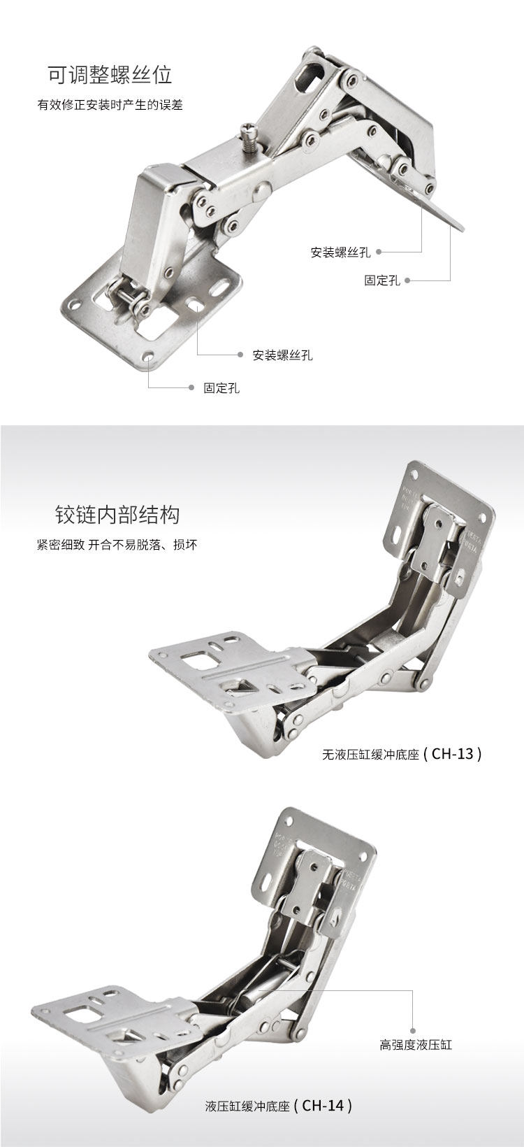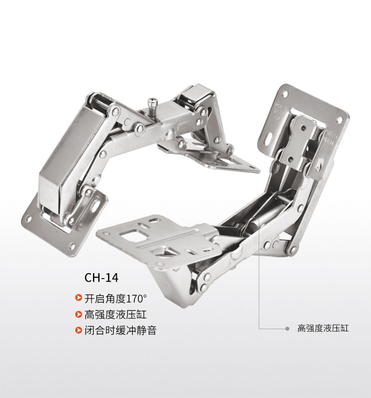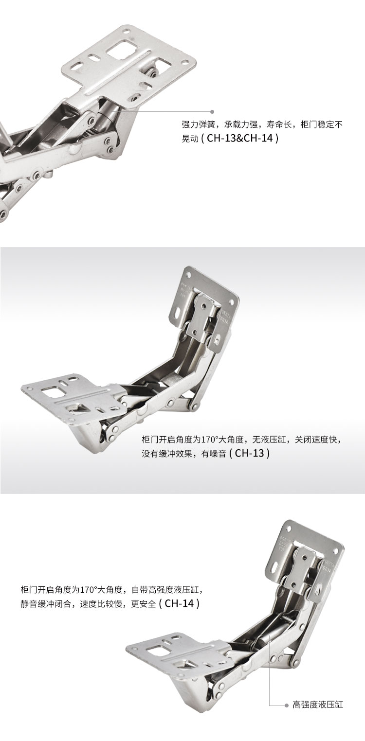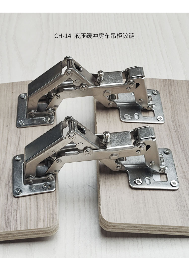 冷軋鋼房車吊柜鉸鏈 免開孔 無需加裝氣撐 柜門自動撐起 適用門厚15-40mm 開啟角度170° 使用范圍房車吊柜、衣柜等