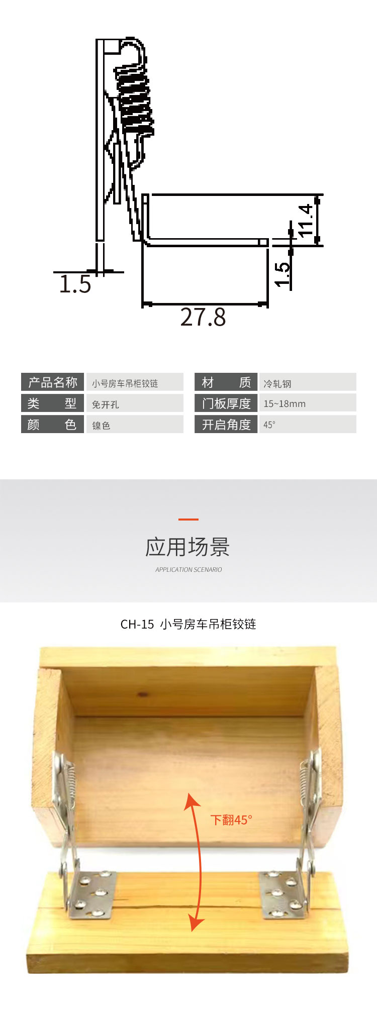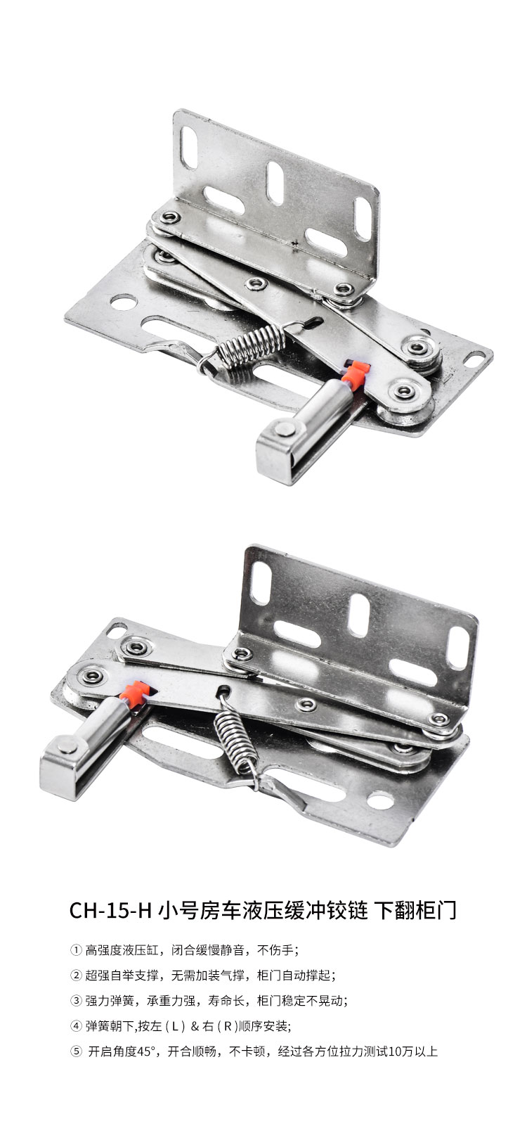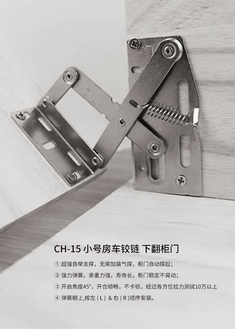 冷軋鋼房車吊柜鉸鏈,緩沖鉸鏈, 免開孔 無需加裝氣撐 柜門自動撐起 適用門厚15-18mm 開啟角度45° 使用范圍房車吊柜、衣柜等