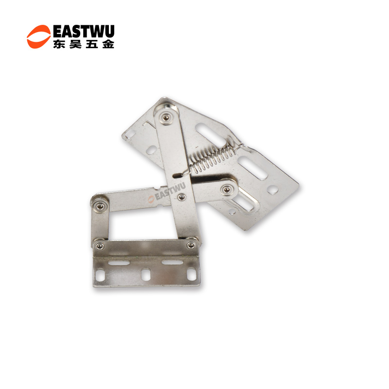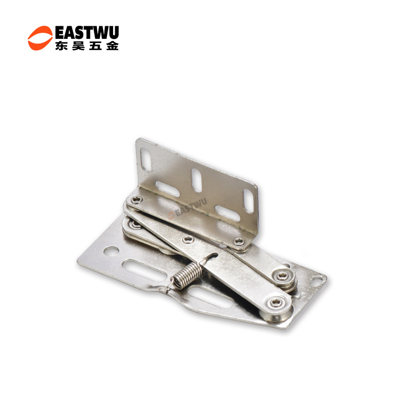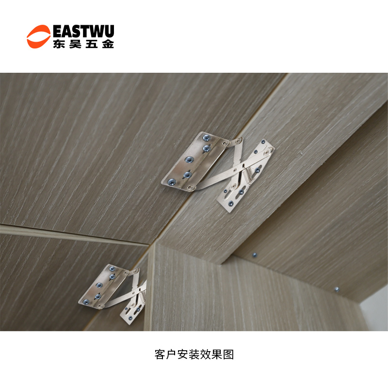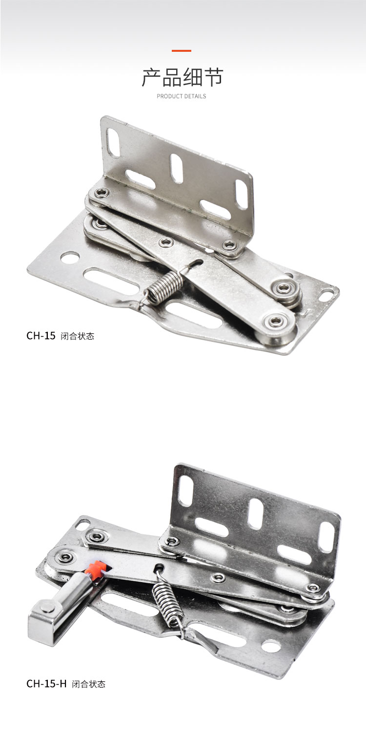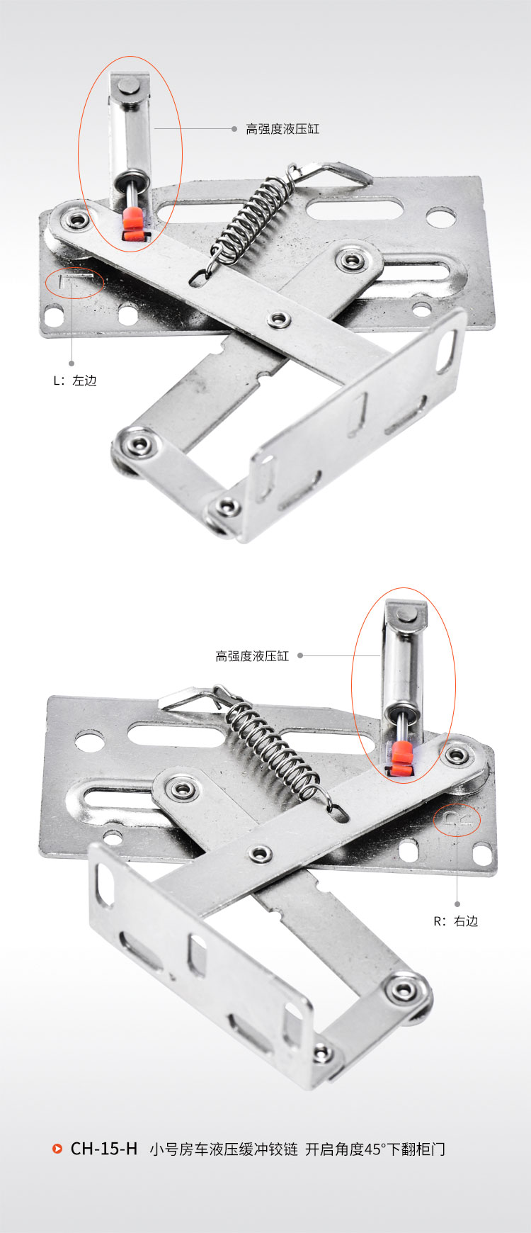 冷軋鋼房車吊柜鉸鏈,緩沖鉸鏈, 免開孔 無需加裝氣撐 柜門自動撐起 適用門厚15-18mm 開啟角度45° 使用范圍房車吊柜、衣柜等
