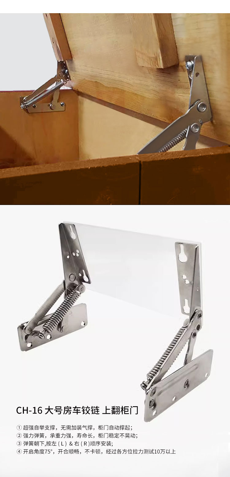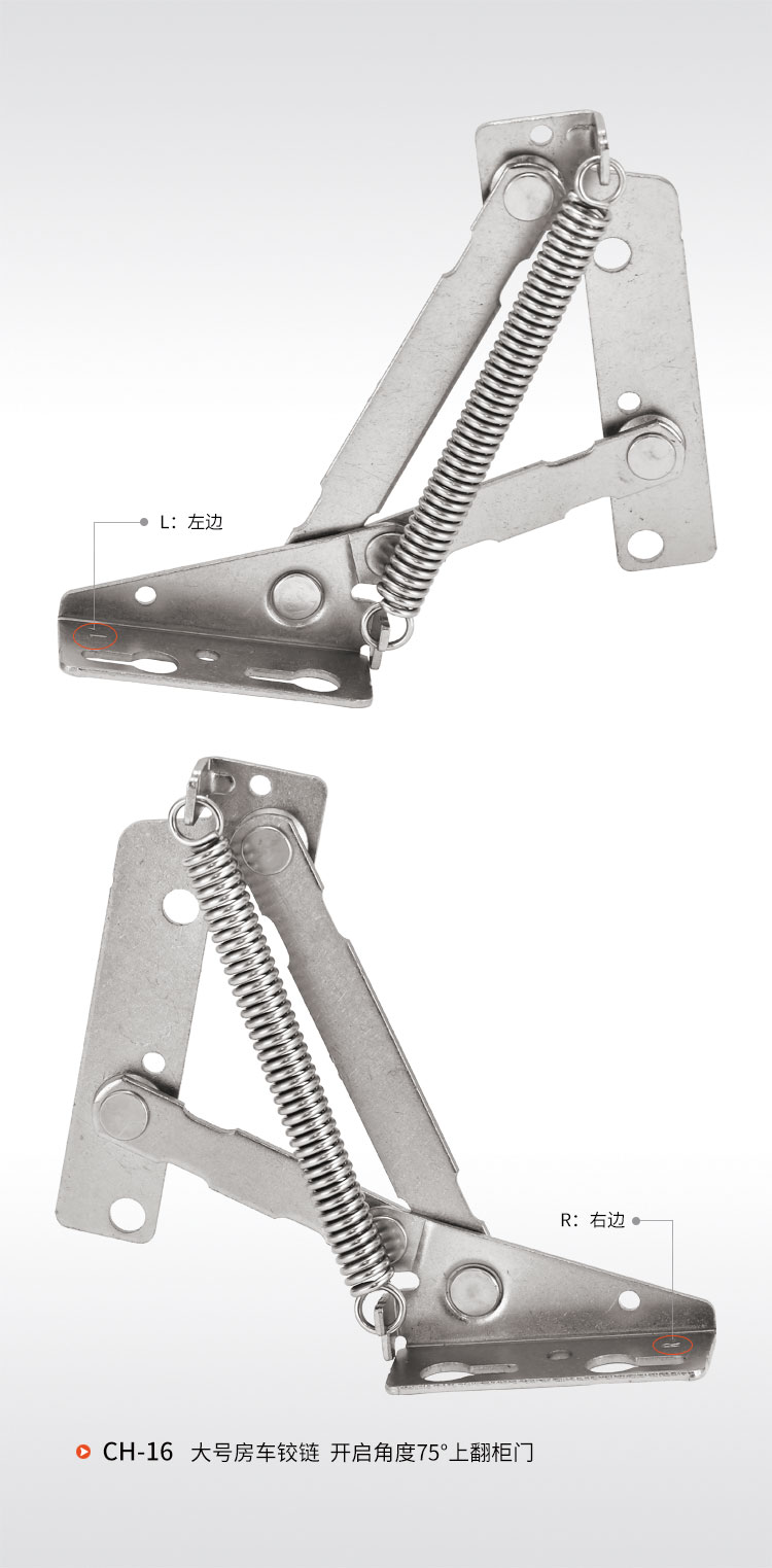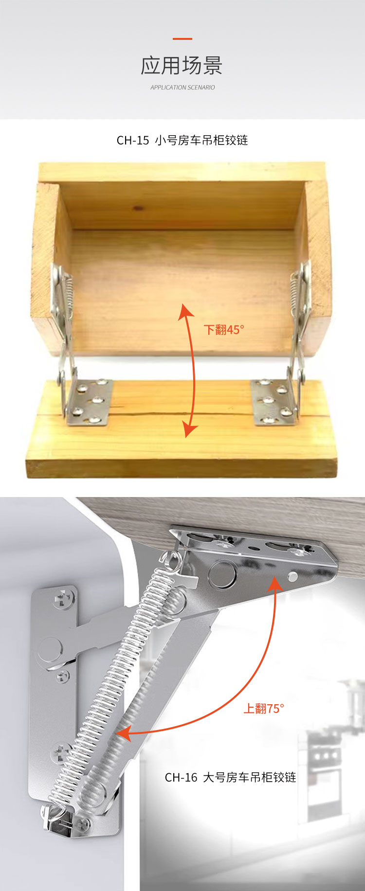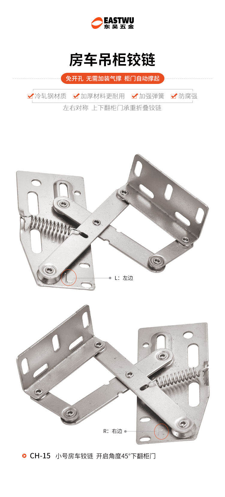 冷軋鋼房車吊柜鉸鏈 免開孔 無需加裝氣撐 柜門自動撐起 適用門厚15-18mm 開啟角度75° 使用范圍房車吊柜、衣柜等