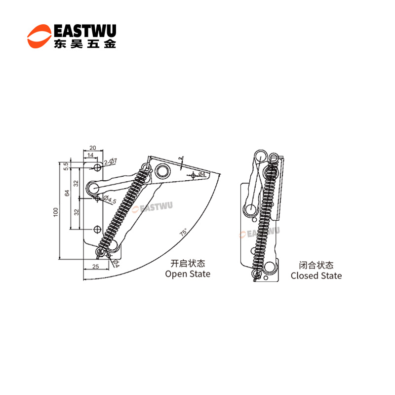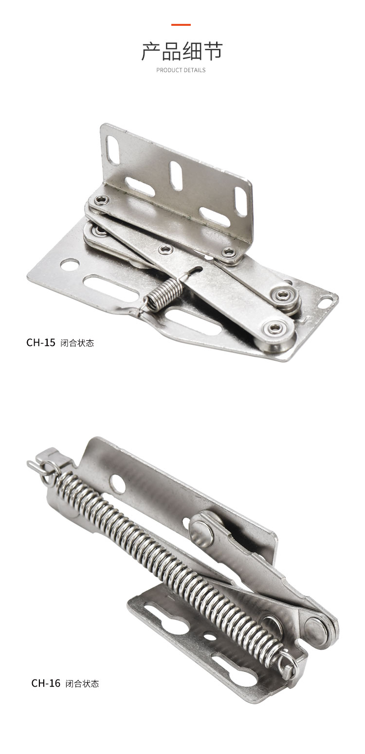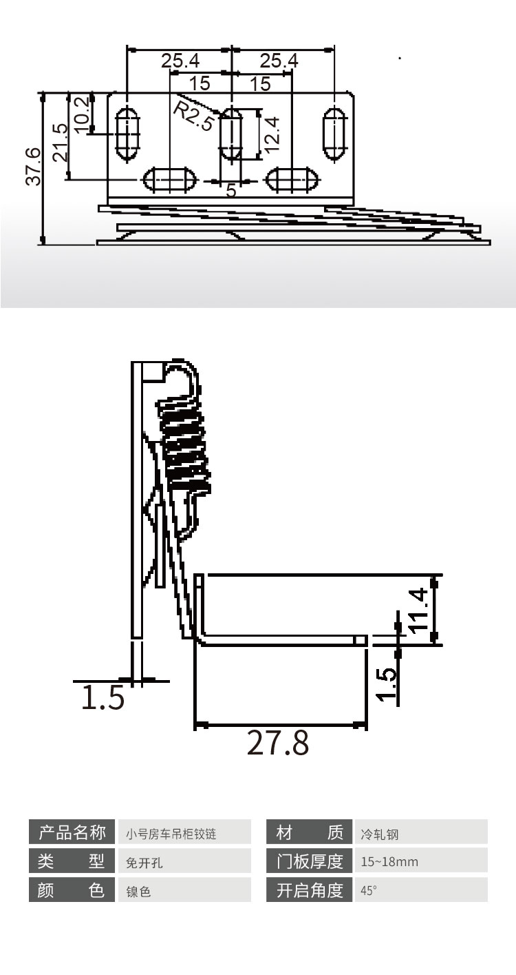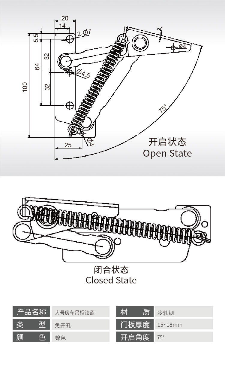 冷軋鋼房車吊柜鉸鏈 免開孔 無需加裝氣撐 柜門自動撐起 適用門厚15-18mm 開啟角度75° 使用范圍房車吊柜、衣柜等