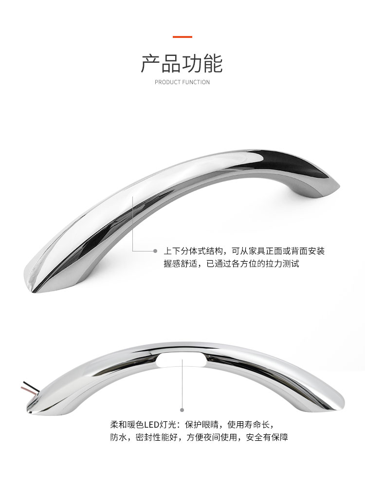 鋅合金&鋁合金LED上車門扶手 功率1W 電壓12V 工作溫度20-45℃ 防水等級IP20 上下分體式結(jié)構(gòu),可以從家具正面或背面安裝