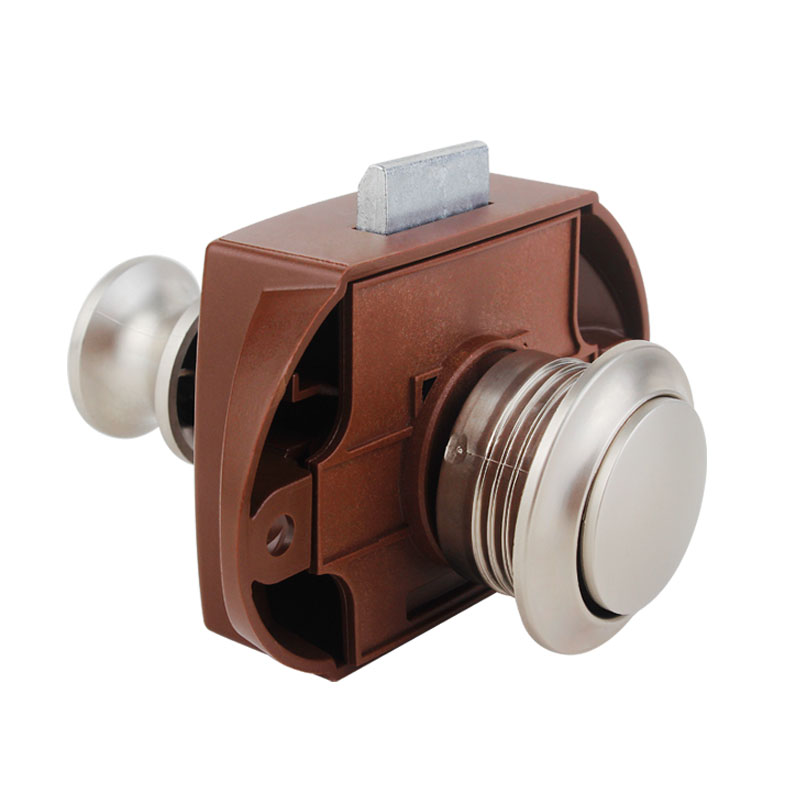 ·材質(zhì):珍珠鎳按鈕 棕色底座 鋅合金拉桿按鈕鎖 適合門板厚度:15~18mm 開孔尺寸:Φ27mm