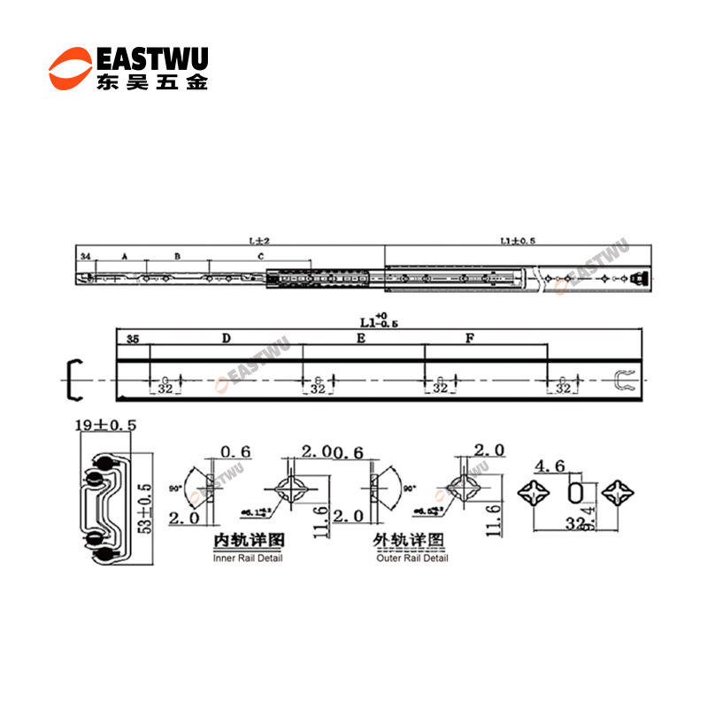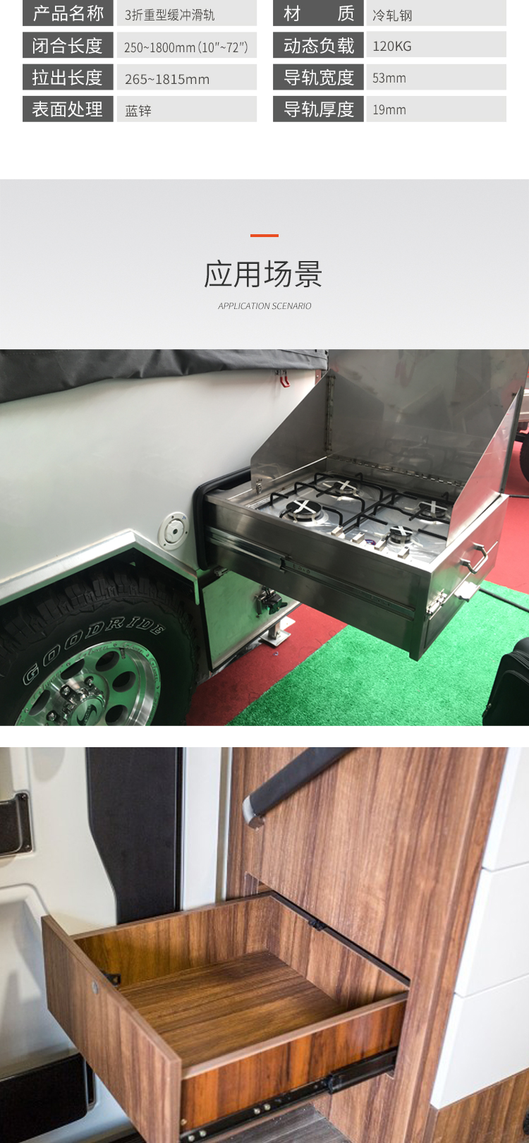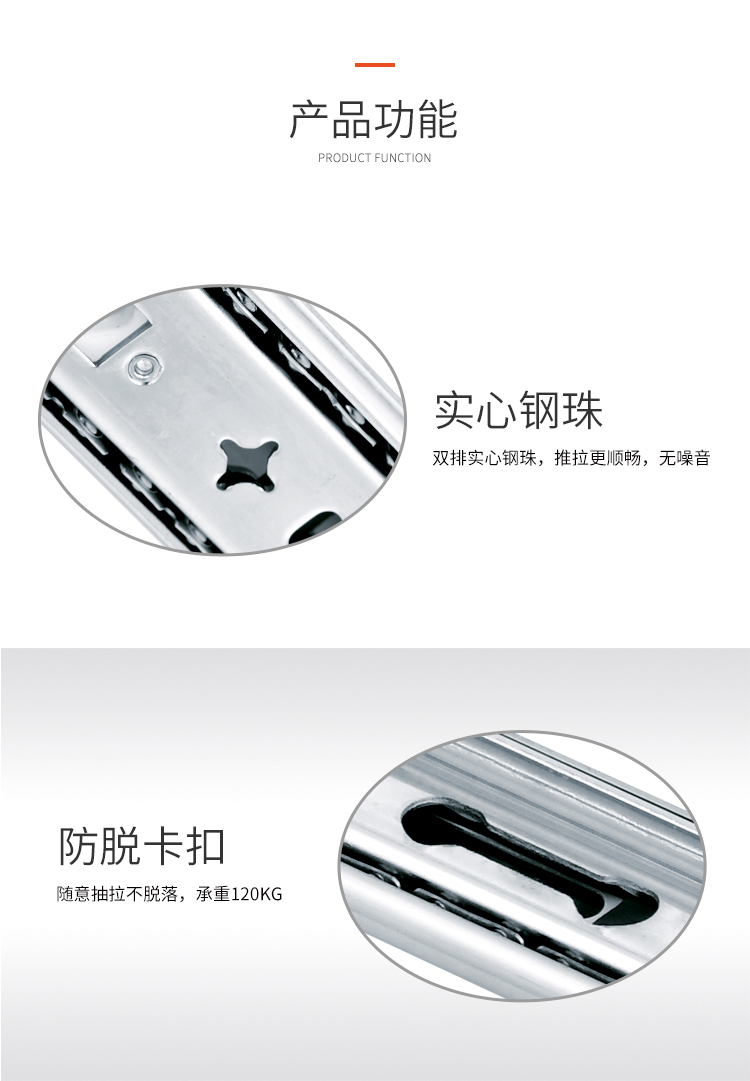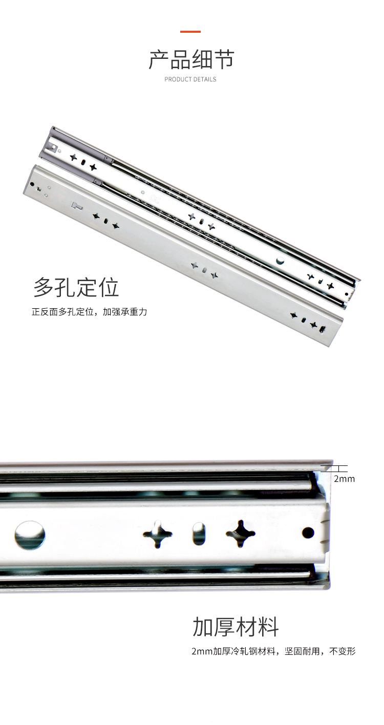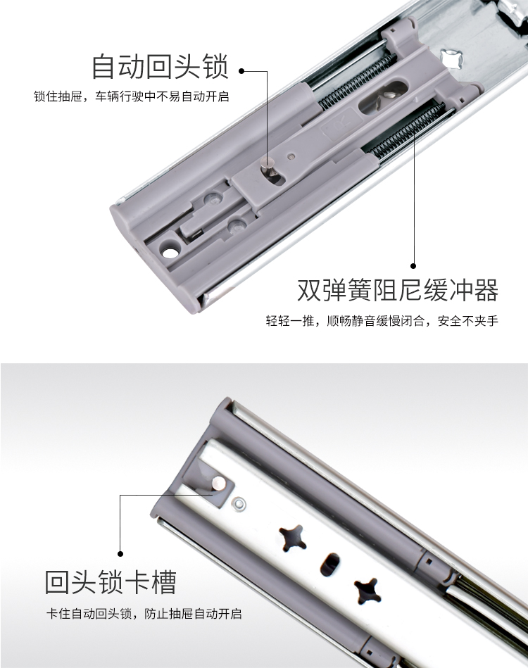 ·適用房車櫥柜、工業(yè)抽屜 安裝在抽屜側(cè)面 承重:120KG 長度:250-1800mm 導(dǎo)軌寬度:53mm 導(dǎo)軌厚度:19mm 材料厚度:2.0mm 使用范圍:房車櫥柜、工業(yè)抽屜等