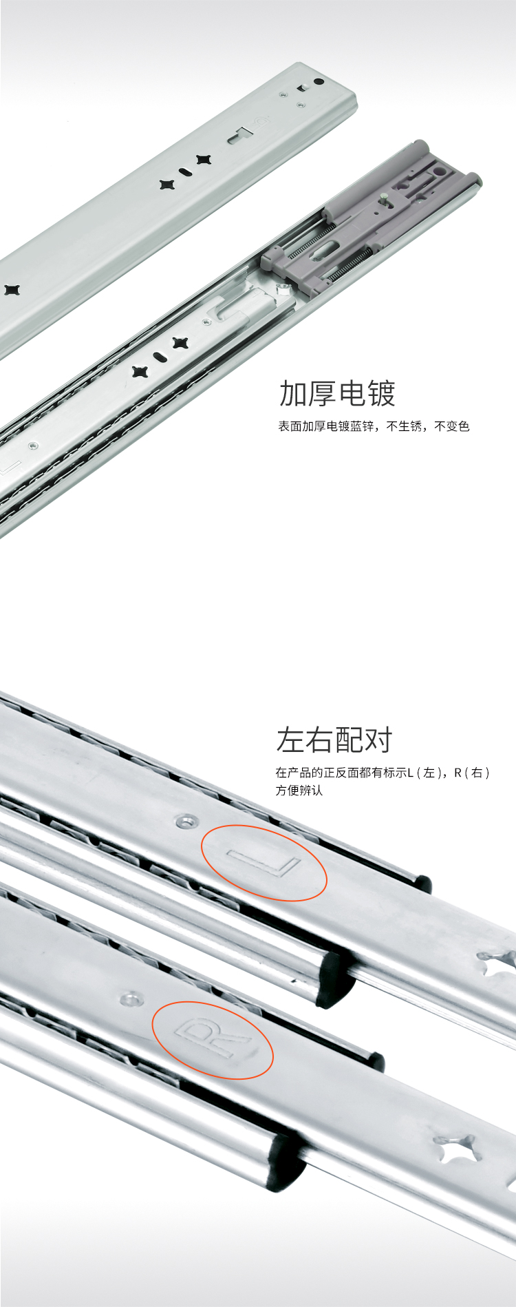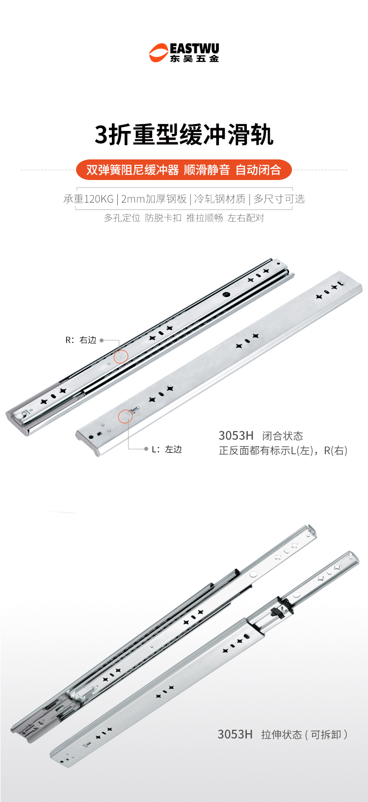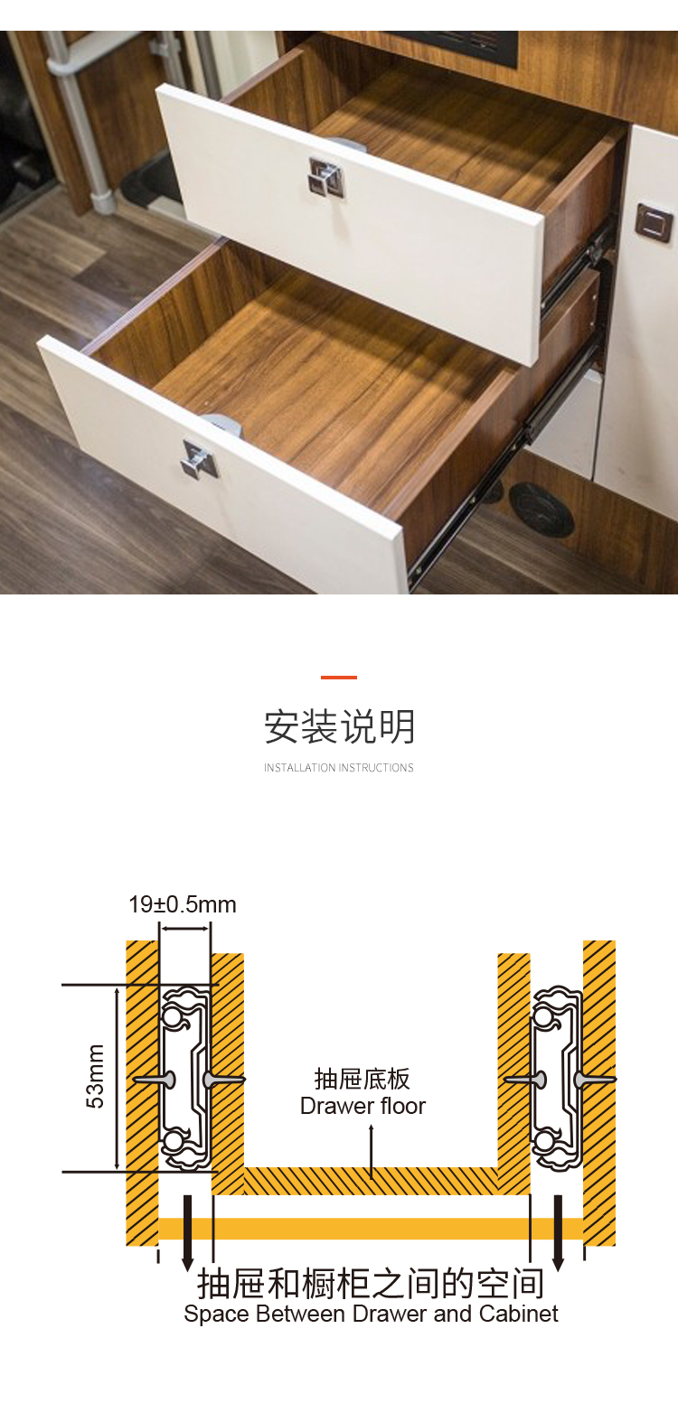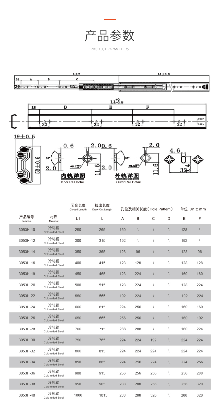 ·適用房車櫥柜、工業(yè)抽屜 安裝在抽屜側(cè)面 承重:120KG 長度:250-1800mm 導(dǎo)軌寬度:53mm 導(dǎo)軌厚度:19mm 材料厚度:2.0mm 使用范圍:房車櫥柜、工業(yè)抽屜等